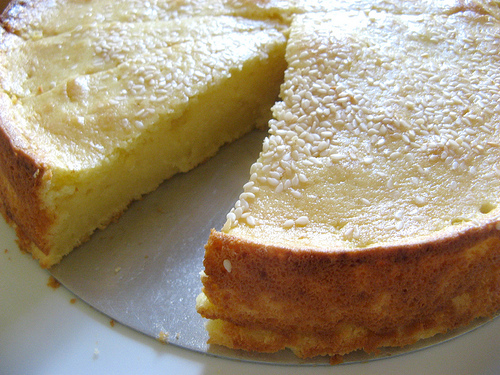 3. Transfer batter to pan and smooth top. Sprinkle with sesame seeds. Bake until a wooden skewer inserted into the center of the cake comes out clean, 30-40 minutes.