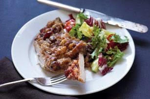 PLACE chops in 13x9-inch baking dish; set aside. Mix cranberry sauce, barbecue sauce and sugar. Add to stuffing; mix lightly. Spoon evenly over chops.