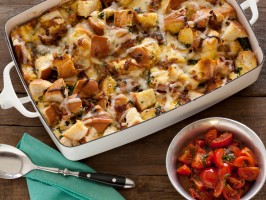 Serve large spoonfuls of the strata onto plates and top with sauteed tomatoes.