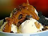 Scoop ice cream into 4 ice cream sundae bowls. Top with the crushed cookies, chocolate chips, chopped pecans and caramel sauce.