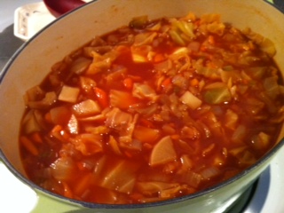Place 6 cups of beef stock in large pot (I used 2 32-oz cartons of Swanson Low Sodium Beef Broth, reserving 2 cups). Bring to a simmer, whisk in tomato paste. Add cabbage, carrots, celery and turnips. Add salt and pepper to taste. Simmer uncovered, until veggies are tender, about 1.5 hours. Enjoy smells of kitchen!