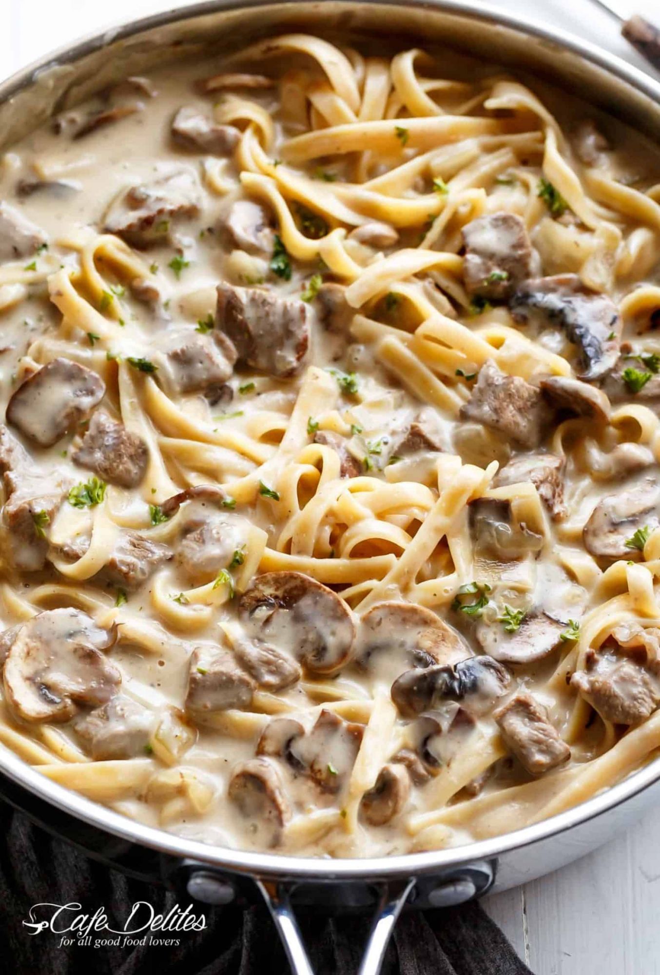 While pasta is boiling, melt 2 tablespoons of butter in a large non-stick frying pan over medium heat. Sear the steak in single layer batches until browned; transfer to a separate plate and set aside until all batches are done.