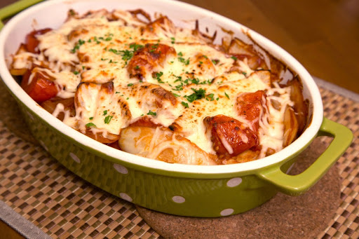 In another large pan over medium-high heat, heat up 1 tablespoon vegetable oil. Stir in the onions and cook until light brown, about 3 minutes. Add the tomatoes and cook until slightly soften, about 3 minutes. Stir in the sauce. Turn the heat down to medium-low. Cook for 2 more minutes. Pour the sauce and mixture over the pork chop and fried rice. Top with mozzarella cheese and Parmesan. Cook in the oven for 15 – 20 minutes or until the cheese is golden brown. Serve immediately.