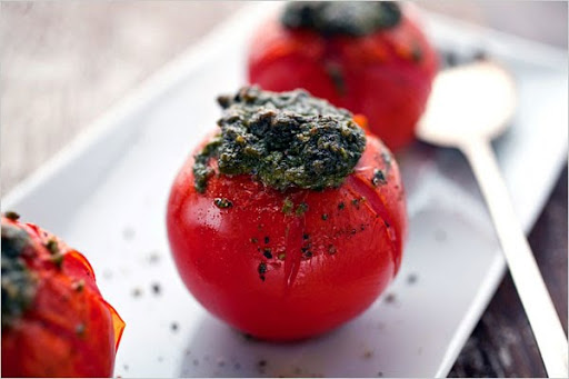 1. Preheat the oven to 425 degrees. Oil a baking dish that will snugly accommodate the tomatoes. Core the tomatoes, and season with salt and pepper. Place a spoonful of pesto into each core.