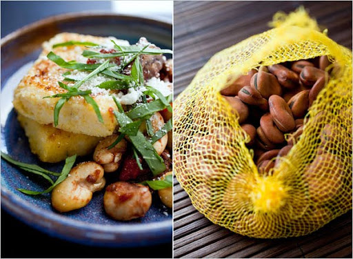 4. When the polenta is ready, remove from the heat, spoon onto plates and make a depression in the middle. Top with the mushrooms, favas and tomatoes, and sprinkle with basil and Parmesan. Serve at once.