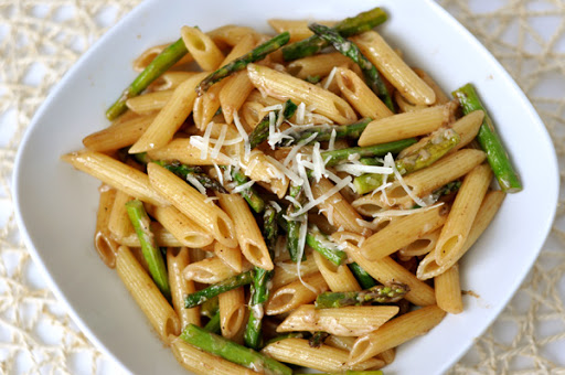 Cook the penne in a large pot of boiling salted water until just done, 11-13 minutes. Drain the pasta and return to the pot. Stir in the butter and vinegar mixture. Toss to combine well. Add in the asparagus, Parmesan, and the remaining ½ teaspoon salt. Serve immediately with additional Parmesan cheese for serving.