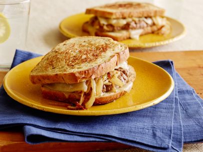 Assemble the patty melts this way: Slice of bread, slice of cheese, hamburger patty, a quarter of the cooked onions, another slice of cheese and another slice of bread.