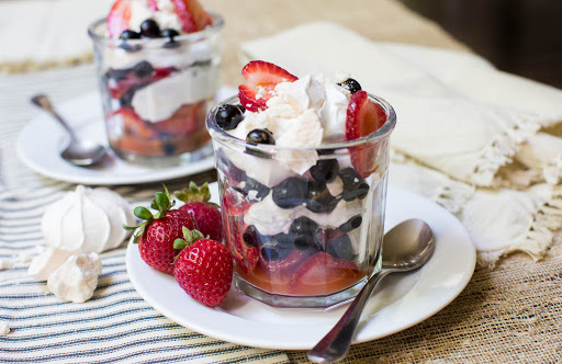 2. Place cream and sugar in a large bowl; beat with a mixer at high speed until stiff peaks form. Spoon over strawberry mixture; sprinkle with pistachios. Garnish with mint sprigs, if desired. Serve immediately.