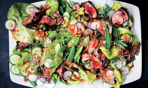 Arrange lettuce on a platter; season with salt and pepper and drizzle with half of reserved dressing. Top with steak, cooked peas, cucumbers, and radishes. Drizzle with remaining dressing and top with peanuts, scallions, and raw peas.