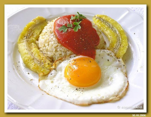 • Montamos el plato con una base de arroz, encima colocamos el huevo frito, añadimos la salsa de tomate caliente y acompañamos con el plátano frito