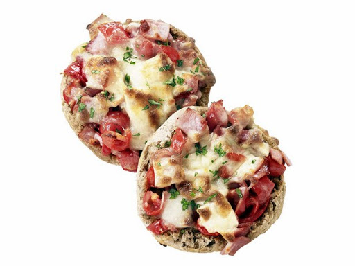 Place the English muffin halves cut-side up on the baking sheet. Top each with tomato and drizzle with the olive oil. Sprinkle the Canadian bacon over the tomatoes, then top with the mozzarella. Bake for 10 to 12 minutes, or until the cheese is melted and beginning to brown. Sprinkle with basil.