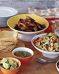Mound the steak, chicken and vegetables in 3 bowls and serve with the tortillas, Salsa Verde, Pico de Gallo, cilantro and sour cream.