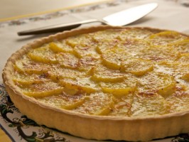 Pour the egg mixture slowly into the dough, using a spoon to make sure you create an even layer. Get creative and place the sliced potatoes very gently on top of the egg mixture, creating a pleasant concentric pattern. Sprinkle the top of the cake with freshly grated Parmesan, 3 or 4 small tabs of butter and some ground pepper. Place the pan on a sheet tray.