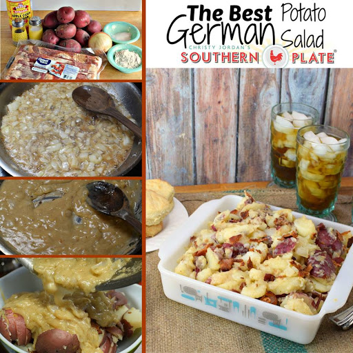 Boil the potatoes whole, without peeling, until fork tender. Drain and allow to cool until you can handle them. Slice as thin as you can into a large bowl. Set aside.