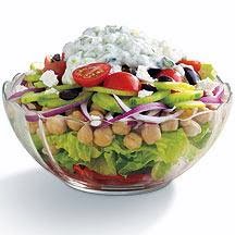 Meanwhile, layer salad ingredients in a large glass container in the following order: red pepper, half of lettuce, chickpeas, onion, remaining lettuce, cucumber and tomatoes. Refrigerate salad until ready to serve.