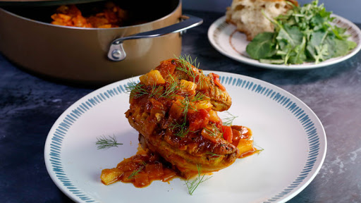 Heat oil, 1 turn of the pan, in a deep skillet with a tight-fitting lid. Brown chicken on both sides and remove to a plate. Add more olive oil, 2 turns of the pan, then add fennel, onion, celery, garlic, bay and thyme, and cook to soften 7-8 minutes. Add wine and reduce by half; add stock, saffron (if using) and tomatoes. Stir, set chicken back into pan and bring to boil; reduce heat to medium and cover pan. Cook chicken 15-20 minutes until juices run clear. Serve chicken from the pan with torn-up crusty bread for mopping up the delicious vegetables in sauce. Serves 4