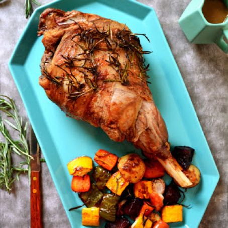 1. Preheat oven to 200C. Using a sharp paring knife, make 18 to 20 slits all over the lamb. Insert one or two slices of garlic, followed by small sprigs of rosemary into each slit.