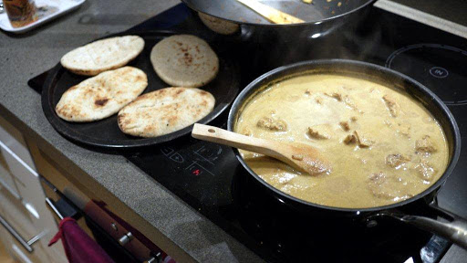 Pour over the stock and coconut milk, bring to the boil, season with salt, cover tightly and reduce heat to low. Simmer gently for 20-25 minutes, stirring occasionally until the chicken is cooked through. Serve immediately with rice.