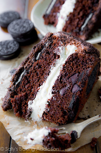 Place 1 cooled layer on a cake stand or large plate, Oreo cookie side down.