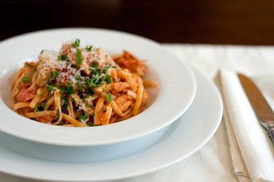 Pour sauce over the top of the pasta. Toss with the Parmesan, basil, and parsley until coated. Add a couple of splashes of pasta water - or if you forget to reserve it, some chicken broth - if you need to thin the sauce a bit.