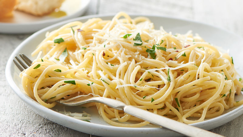 In 4-quart saucepan or Dutch oven, cook spaghetti as directed on box; drain. Return to saucepan; toss with roasted garlic, remaining 2 tablespoons oil, 1/2 cup of the Parmesan cheese, the salt, red pepper flakes and basil. Sprinkle with remaining 1/2 cup Parmesan cheese. Serve immediately.