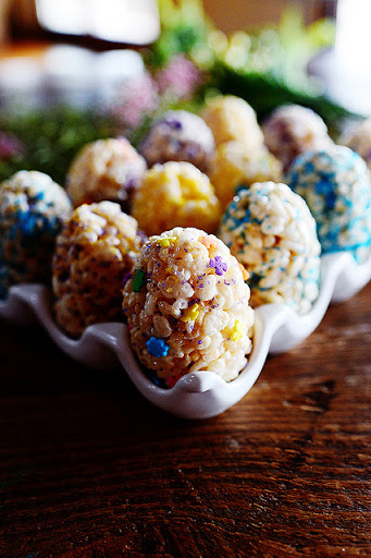 Take small amounts of the mixture and fill both sides of a plastic egg, slightly over-filling one side. If the mixture is too sticky, you can spray your hands with a light cooking spray. Press a chocolate egg in the center on one side of the egg, then close the plastic egg to shape it. (It should be full enough to meet with a little resistance as you close it.) Gently release the rice cereal egg from the mold, decorate with your choice of sprinkles and set aside in an egg crate until set. Repeat with the remaining rice cereal mixture and chocolate eggs.