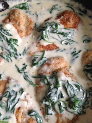 5. Stir in one tablespoon flour and stir constantly while cooking for another minute. Add the chicken broth to the skillet and bring the mixture to a low simmer, whisking constantly, until slightly thickened, about 3-4 minutes. In a small bowl, whisk together the cornstarch and cream. Add the spinach, milk and cream mixture to the skillet. Bring the mixture to a simmer and cook, stirring occasionally, until the spinach is wilted and sauce is slightly thickened, about 2-4 minutes. Stir in the Parmesan cheese.Add the chicken and simmer for a couple of minutes