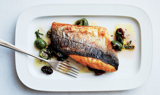 To serve, spoon a bit of vinaigrette onto plates and place fish on top, skin side up (no point in working so hard to create a beautifully crisp skin only to cover it up with sauce!).