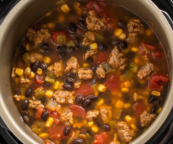 1. Set the pressure cooker to the “brown” or high setting, and add the oil to the cooker. Add the onion and celery and sauté for 2 minutes. Add the turkey, and cook, breaking up the meat, for 3 to 4 minutes, or until the pink is gone.