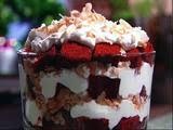 Using a serrated knife cut the red velvet cake into 1-inch squares. Add about 1/3 of the squares to the bottom of the trifle bowl. Spread a layer of the whipped cream on top of the cake squares, followed by a layer of toasted coconut. Repeat layering 2 more times and serve.