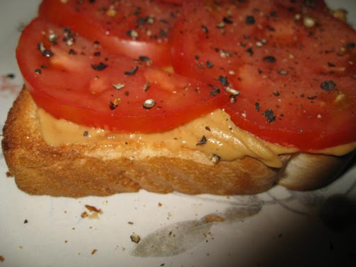 Spread peanut butter on hot toast. Completely cover the toast with tomato slices. Sprinkle liberally with black pepper, and add just a bit of salt, if desired. Eat!
