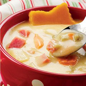 Reduce heat; cover and simmer until vegetables are tender. Stir in ham; set aside.