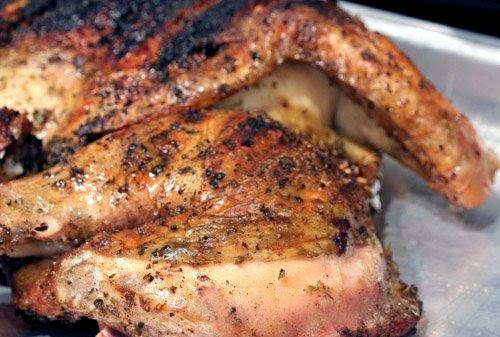 The classic Tuscan chicken cooked under a brick. The goal is to get crispy skin and cook the chicken quickly. You can use whatever herb combo you want for the dry rub - I have seen recipes using all sorts of things. I am partial to the unique "hum" that fennel pollen gives to poultry.