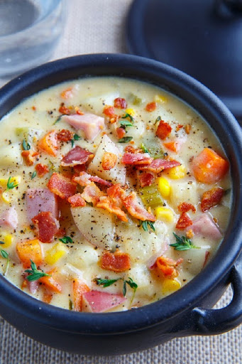 Add the ham and corn, cook until heated and season with salt and pepper.