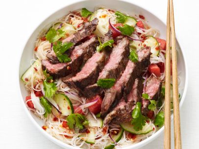 Add all but a few tablespoons cilantro to the noodle salad and toss. Top with the steak and the remaining cilantro.
