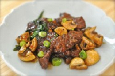 Add soy sauce, water, Maggi seasoning, brown sugar, and rice wine vinegar. Stir until the sauce thickens, return meat to pan, and add quartered button mushrooms to the pan. Cook for another 60 seconds or so and add half of the chopped scallions. When serving the Mongolian beef add remaining scallions to the dish.