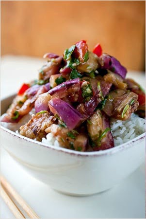 5. Place the rice on a platter or on individual plates, top with the eggplant mixture and serve.