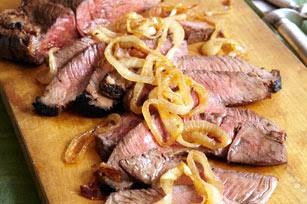 MEANWHILE, heat broiler. Remove steak from marinade; discard marinade. Place steak on broiler pan. Broil steak, 4 inches from heat, 8 min. on each side or until done (160ºF). Remove from heat; cover. Let stand 5 min. before cutting across the grain into thin slices. Stir remaining steak sauce into onions. Serve with the meat.