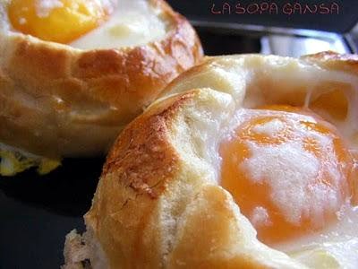 Se reparte esta mezcla entre los 4 panes, encima de ella se distribuye el jamón cortado en dados, se pone sobre el jamón una loncha de queso, encima se añaden dos huevos en cada panecillo, se espolvorea con queso rallado y una nuez de mantequilla y se mete en el a 180º, unos 10 minutos o hasta que los huevos estén cuajados y los panecillos dorados