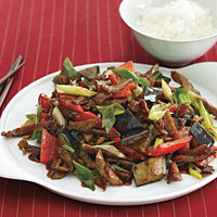 Add the remaining 1 1/2 tablespoons oil to the skillet, add the eggplant and cook, stirring, until slightly softened, about 3 minutes. Add the bell pepper and cook, stirring, until crisp-tender, about 2 minutes. In a small bowl, stir together the chicken broth, stir-fry sauce and remaining 1 tablespoon cornstarch; pour over the vegetables and cook, stirring, until the sauce is thickened, 1 to 2 minutes. Return the pork mixture to the skillet and stir until heated through, 1 to 2 minutes.