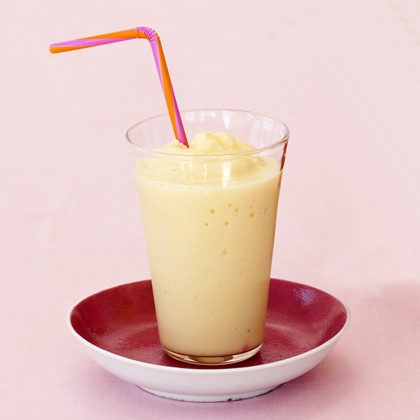 Pour OJ into an ice cube tray and freeze until solid, about 3 hours. Empty the tray into a blender or food processor and combine with honey, yogurt and frozen OJ concentrate, then blend until smooth. Makes 2 1/2 cups.