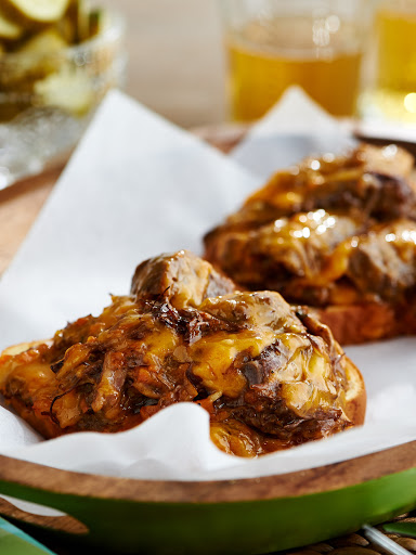 Lay out the slices of bread on a baking sheet. Divide the meat mixture over the bread and top each "sandwich" with a slice of cheese. Bake for about 5 minutes, or until the cheese is melted.