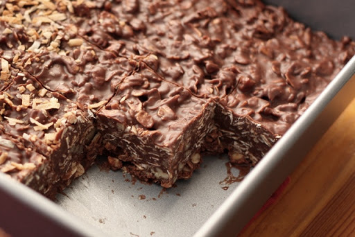 Pour into an 8x8 pan (9x13 is fine well). Refrigerate until the chocolate hardens, at least 3-4 hours. Slice into 1"-2" square pieces. Store in the refrigerator. Enjoy!