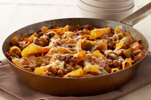 Turn your Ninja to Stove Top High. Add the meat to brown. When almost browned add the green peppers to soften. Add garlic. Drain excess grease. Arrange noodle pieces over beef mixture. Pour sauce, dressing and water over noodles. Set to Stove Top Medium. Cover and cook 15–20 minutes or until noodles are tender. Stir occasionally. Turn off pot. Spoon the cheese over the noodle mixture. Cover and let stand.