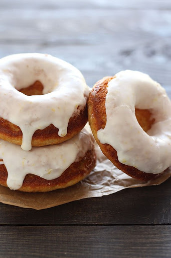 Whisk together the glaze ingredients until smooth. Add more sugar for thickness, more lemon juice for thinness. Dip the doughnuts in glaze and place on a lined baking sheet. Let stand until glaze has set before serving.