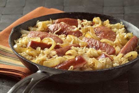 MELT butter in same skillet. Add onions; cook 3 min. or until tender, stirring frequently. Stir in mustard. Add sauerkraut; mix lightly. Cook 10 min., stirring occasionally.