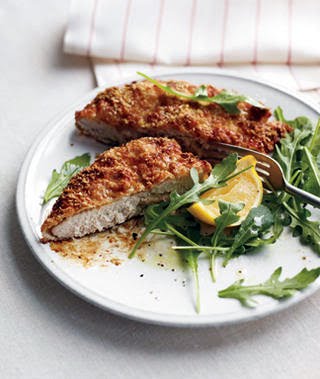 5. Shake the excess buttermilk off one of the chicken breasts, and press it into the first dish, coating both sides with seasoned flour. Shake off the excess flour, then dip it into the second dish, coating both sides with egg mixture. Finally, lay the chicken in the third dish, coating both sides with the cheese-flaxseed mixture. Place the breast on the prepared baking sheet, and repeat with the remaining 3 chicken breasts.