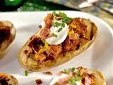 Cut potatoes in half, lengthwise, and spoon out the flesh, leaving a half inch shell.