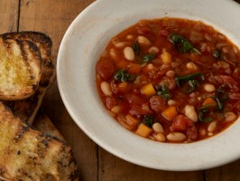 Heat the oil in a heavy large pot over medium heat. Add the onion, carrot, pancetta, minced garlic, salt, and pepper. Cook until the onion is golden brown and the pancetta is crisp, about 7 minutes. Add tomato paste and stir until dissolved. Add tomatoes and stir, scraping the bottom of the pan with a wooden spoon to release all the brown bits. Add the spinach, beans, herbs, stock, bay leaf, and Parmesan rind. Bring the soup to a boil, reduce heat and simmer for 30 minutes.