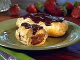 With a serrated knife, slice pastry puffs lengthwise, but not all the way through. Pipe custard mixture into the center. Melt chocolate for icing, add sugar and cream. Cook over medium heat until soft ball stage. Let cool and beat until smooth. Ice tops of the eclairs.